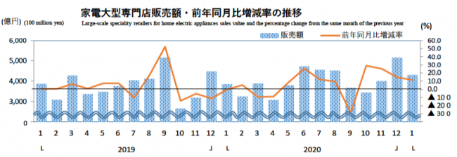 1月家電チェーン統計|販売額4306億円11.4%増/ケーズとエディオン2桁増