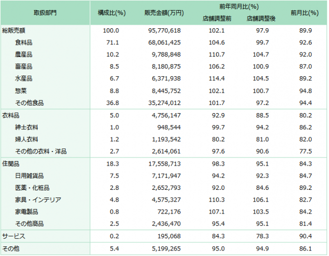 2月度は、新型コロナウイルス感染症感染拡大による緊急事態宣言により内食化傾向が続いているが、食料品ではその他食品が昨年の反動で動きが鈍かった。また、衣料品はテレワークなどによりビジネス関連が苦戦しており、住関品にも反動減が見られ動きも鈍かった。