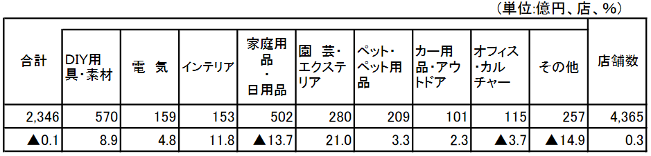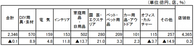 カテゴリー別に見ると、家庭用品・日用品が13.7%減、オフィス・カルチャーが3.7%の減少となった。一方、園芸・エクステリアが21.0%増加インテリアが11.8%増、DIY用具・素材が8.9%増、電気が4.8%増、ペット・ペット用品が3.3%増、カー用品・アウトドアが2.3%の増加となった。