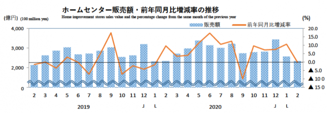 経済産業省発表の「商業動態統計速報」によるホームセンター2月の販売額は2346億円で、前年同月比0.1%減。総店舗数は1月から46店舗減って、4365店舗。