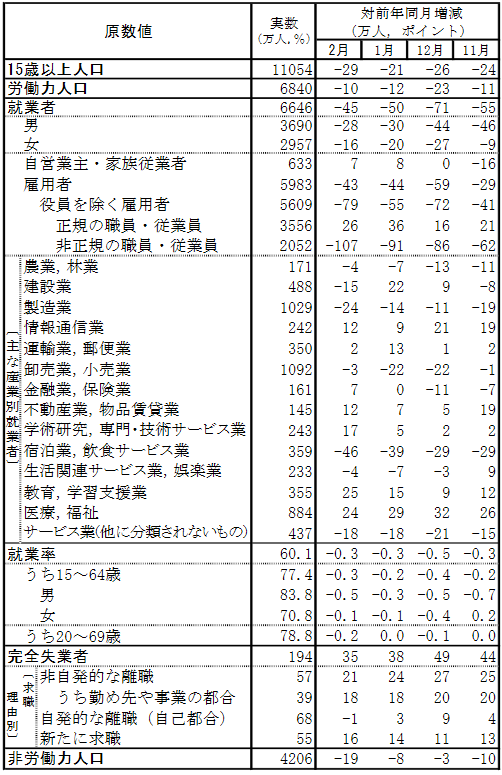 総務省統計局が2月の「労働力調査」を発表した。2月の就業者は6646万人と前年同月に比べて45万人減少、雇用者は5983万人で前年同月に比べて43万人減少している。就業者・雇用者ともに11カ月連続で減少傾向が続く。就業率は60.1%で、前年同月に比べ0.3ポイント低下した。
