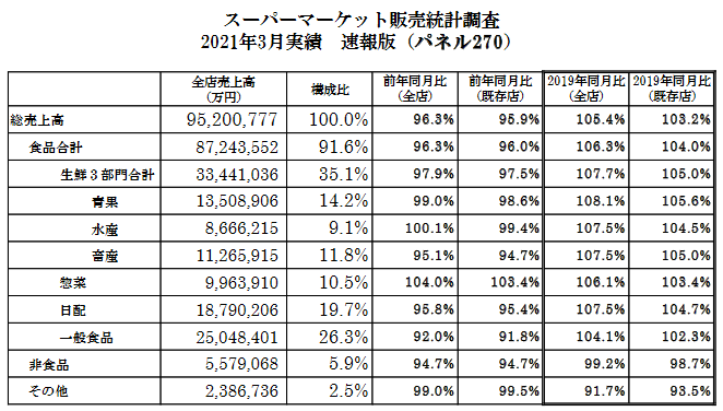 スーパーマーケット3団体による3月の販売統計が発表された。一般社団法人日本スーパーマーケット協会(JSA)、オール日本スーパーマーケット協会(AJS)、一般社団法人全国スーパーマーケット協会(NSAJ)の会員企業のうちのパネル270社の集計になる。