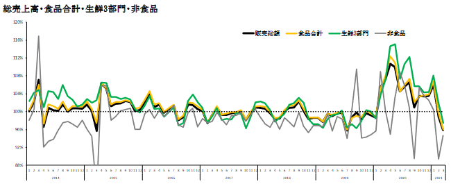 既存店は4.1%減。引き続き巣ごもり傾向による食品需要は堅調だが、前年の食品備蓄行動によって特需が起きた保存性の高い食品や、マスクなどの衛生用品、紙製品の反動が大きかった。総売上高は9520億777万円で前年同月比は3.7%減。