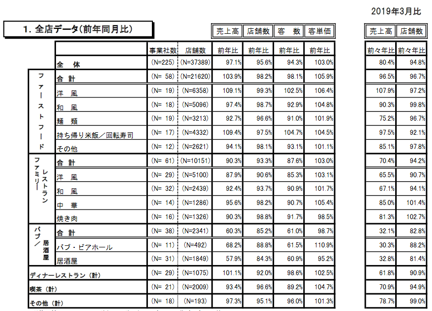 3月外食産業統計|売上高前年比97.1%/洋風FFはテイクアウト需要堅調