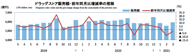 経済産業省発表「商業動態統計速報」によれば、3月のドラッグストア販売額は5940億円、前年同月に比べて2.6%減少した。昨年のコロナ特需の反動だろう。店舗数は前年より40店舗増えて1万6965店。