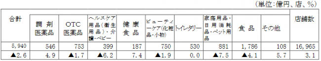 カテゴリー別に見ると、家庭用品・日用消耗品・ペット用品が7.5%減、ヘルスケア用品(衛生用品)・介護・ベビーが6.2%減、食品が4.1%減、ビューティケア(化粧品・小物)が1.9%減、OTC医薬品が1.7%の減少となった。一方、健康食品が7.4%増、調剤医薬品が4.9%の増加だった。
