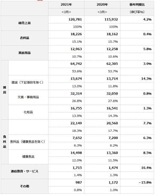 商品別では、「通信教育・サービス」が17億1500万円で前年に比べて16.4%増、「食料品」が221億4900万円7.7%増、「家庭用品」は129億6300万円5.8%増、「雑貨」が647億4200万円3.9%増、「衣料品」が182億2600万円0.4%増だった。