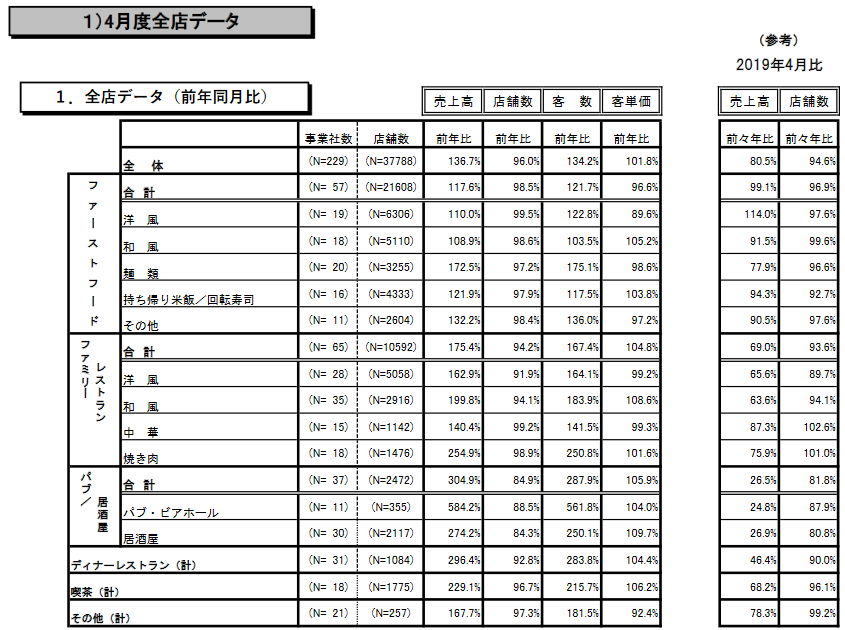 前年4月は調査史上最悪の落ち込みとなったため、今年の全体売上げは対前年同月比136.7%となったが、コロナ禍前の2019年対比では80.5%にとどまり、依然として厳しい。