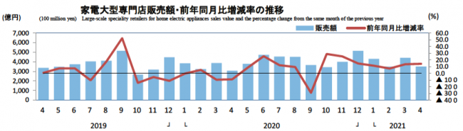 経済産業省の「商業動態統計速報」発表の家電大型専門店の4月の販売額は3510億円で、前年同月比14.2%増。店舗数は前年比1.1%増の2577店。昨年は、緊急事態宣言が発出され、臨時休業する店舗が多く9.0%減だった。その反動で昨年同月比では伸長した。また10月から7カ月連続で前年を上回っている。