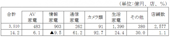 カテゴリー別では、カメラ類が92.7%増、通信家電が61.2%増、生活家電が24.4%増、AV家電も6.1%増だった。一方、情報家電は9.5%のマイナスだった。