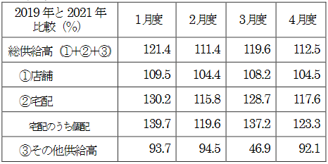 5月度は総供給高が2364億3400万円の前年比93.1%となり、前月に続きコロナ特需のあった前年同月を下回っているが、2019年比では二桁伸長している。店舗が790億3500万円(前年比93.8%)、宅配が1526億1400万円(前年比92.4%)で、宅配のうちの個配は1111億6400万円(前年比93.0%)。