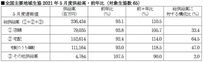日本生活協同組合連合会(東京都渋谷区、土屋敏夫代表理事会長)が全国65主要地域生協の5月度の供給状況(売上高)を発表した。