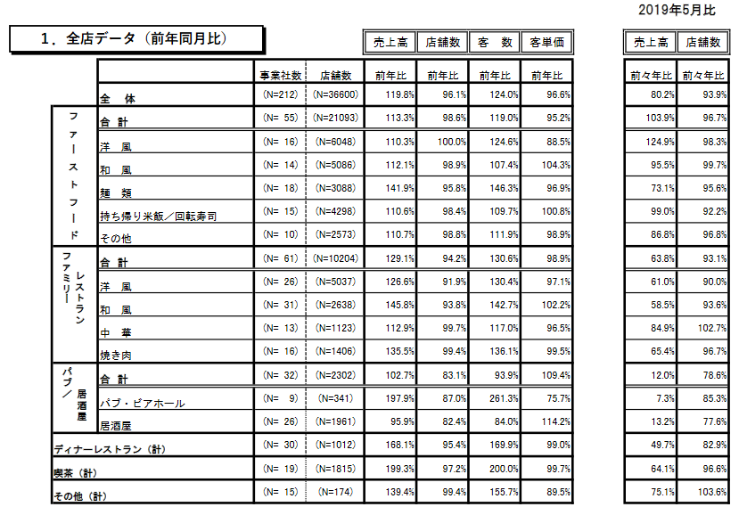 5月外食統計|20年比119.8%も19年比は80.2%/酒類提供業態は壊滅的