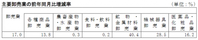 卸売業は29兆7630億円の17.0%増、小売業は11兆9470億円の8.2%増となった。なお、商業販売額の季節調整済前月比は3.8%の低下で、卸売業は2.4%減、小売業は0.4%減。季節調整済みは、季節要因以外に曜日・祝祭日要因、うるう年要因によっても調整されている。