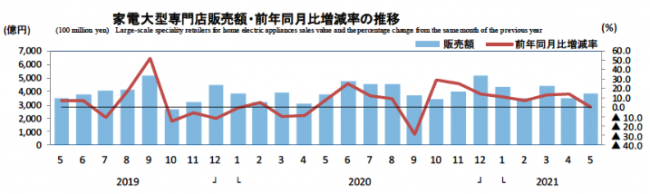 経済産業省の「商業動態統計速報」の家電大型専門店の5月の販売額は3820億円で、前年同月比0.7%増だった。店舗数は前年比1.2%増の2585店。昨年は、緊急事態宣言が継続され、臨時休業や時短営業が続いたが、それでも8.6%増と回復傾向にあった。今年の5月はこの反動によって微増となった。10月から8カ月連続で前年を上回っている。休業や時短にも負けず、好調である。