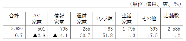 カテゴリー別では、カメラ類が51.8%増、通信家電が30.7%増、生活家電が1.3%増だった。一方、情報家電は14.1%減、AV家電も2.8%のマイナスだった。