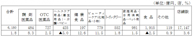 カテゴリー別に見ると、健康食品が12.6%増、ビューティーケア(化粧品・小物)が11.5%増、調剤医薬品が8.3%増、OTC医薬品が2.5%増、トイレタリーが1.8%増、家庭用品・日用消耗品・ペット用品が1.5%の増加だった。一方、ヘルスケア用品(衛生用品)・介護・ベビーが5.0%減、食品が2.5%の減少となった。