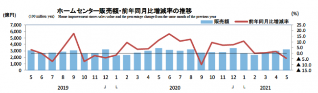 経済産業省発表の「商業動態統計速報」によるホームセンター5月の販売額は3230億円で、前年同月比4.6%減。総店舗数は4月から5店舗減って、4374店舗。