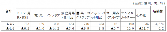 カテゴリー別に見ると、インテリアが14.2%減、DIY用具・素材が6.2%減、園芸・エクステリアが5.9%減、家庭用品・日用品が3.6%減、カー用品・アウトドアが0.7%の減少となった。一方、オフィス・カルチャーが10.0%増、ペット・ペット用品が8.8%の増加となった。