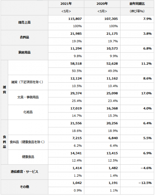 商品別でみると、「衣料品」は前年同月比3.8%増、「家庭用品」は6.8%増、「食料品」は6.4%増、「雑貨」は11.2%増と大きく伸長した。一方、「通信教育・サービス」は4.6%減となった。