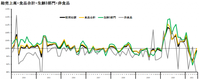 依然として在宅傾向が高く、堅調な食品需要が続いているが、前年の分散登校などによって需要が高かった保存性の高い食品や、マスクなどの衛生用品、紙製品に関しては反動減が続いている。一方で、前年6月は緊急事態宣言が解除されていたことから、前年同月比としては、3月~5月実績に比べると、反動幅は縮小した。
