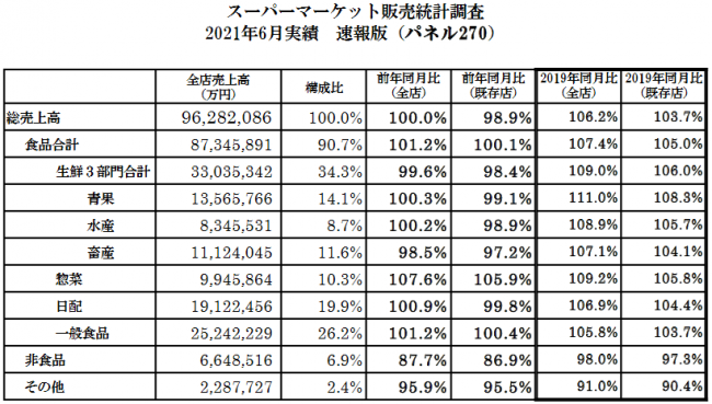 スーパーマーケット3団体による6月の販売実績が発表された。一般社団法人日本スーパーマーケット協会(JSA)、オール日本スーパーマーケット協会(AJS)、一般社団法人全国スーパーマーケット協会(NSAJ)の3団体会員企業のうちの270社の集計になる。