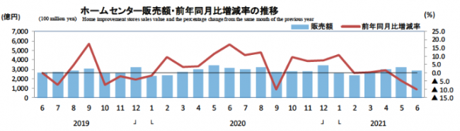 経済産業省発表の「商業動態統計速報」によるホームセンター6月の販売額は2831億円で、前年同月比10.1%減。総店舗数は5月から8店舗減って、4366店舗。