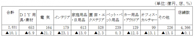 カテゴリー別に見ると、インテリアが23.1%減、オフィス・カルチャーが13.1%減、家庭用品・日用品が13.0%減、カー用品・アウトドアが12.5%減、DIY用具・素材が6.9%減、園芸・エクステリアが2.3%の減少となった。一方、ペット・ペット用品だけが0.3%増加で前年をクリアした。