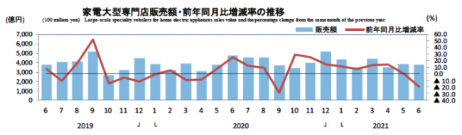 経済産業省の「商業動態統計速報」の家電大型専門店の6月の販売額は3786億円で、前年同月比19.9%減だった。店舗数は前年比0.7%増の2582店。昨年は緊急事態宣言が解除されていたことや特別定額給付金などにより販売が復調傾向だったことの反動で大幅にマイナスとなった。