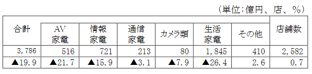 カテゴリー別では、生活家電が26.4%減、AV家電が21.7%減、情報家電が15.9%減、カメラ類が7.9%の減少、通信家電が3.1%の減少となった。