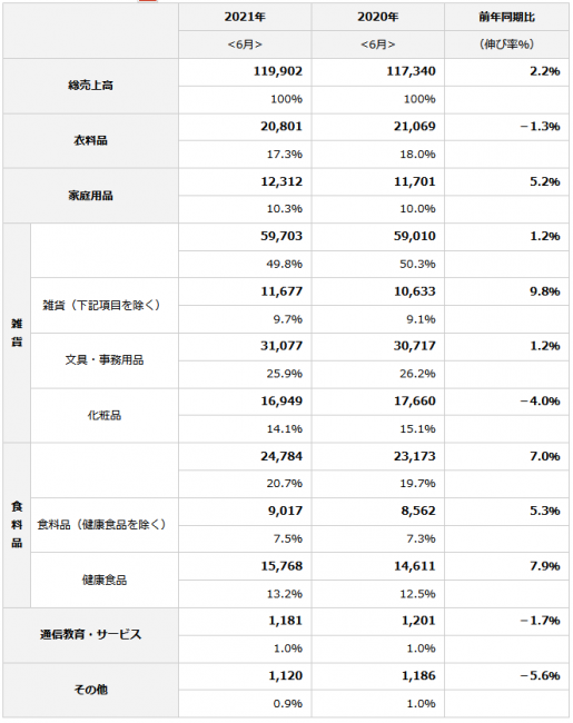 商品別でみると「食料品」が前年同月比7.0%増、「家庭用品」は5.2%増、「雑貨」は1.2%増と好調だった。雑貨では「趣味・娯楽用品」が9.8%増と大幅に伸長している。また食料品の中でも「健康食品」が7.9%も増加している。