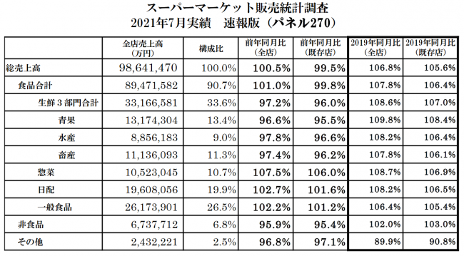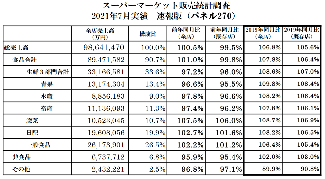 7月スーパーマーケット統計|既存店0.5%減/総売上高は9864億円0.5%増