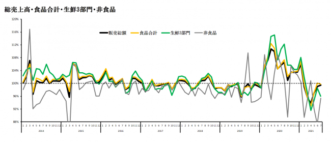 引き続き、感染拡大への警戒感が高い状況であり、飲食店への時短や酒類提供自粛などの要請が続いている地域も多く、家飲み需要、家庭内消費需要は堅調に推移している。しかし、気温の上昇やオリンピック観戦などを背景に調理を敬遠する傾向も指摘されており、相場の影響を受けているとはいえ、これまで好調を牽引していた生鮮品にやや陰りが見られる。