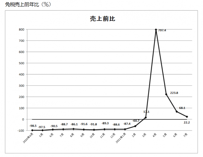 しかし、2019年比では免税総売上高は86.2%減、購買客数は97.9%減と厳しい状況が続いている。