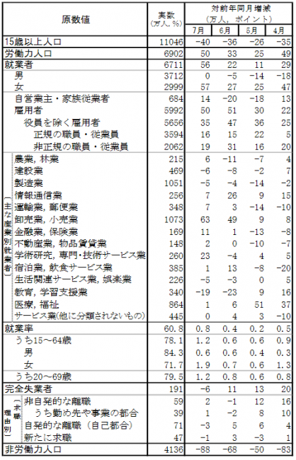 総務省統計局が発表した7月の「労働力調査」では、就業者は6711万人と前年同月に比べて56万人増加し、就業率は60.8%と0.8ポイント上昇した。また雇用者も5992万人と前年同月に比べて50万人増加した。就業者も雇用者も4カ月連続の増加となった。