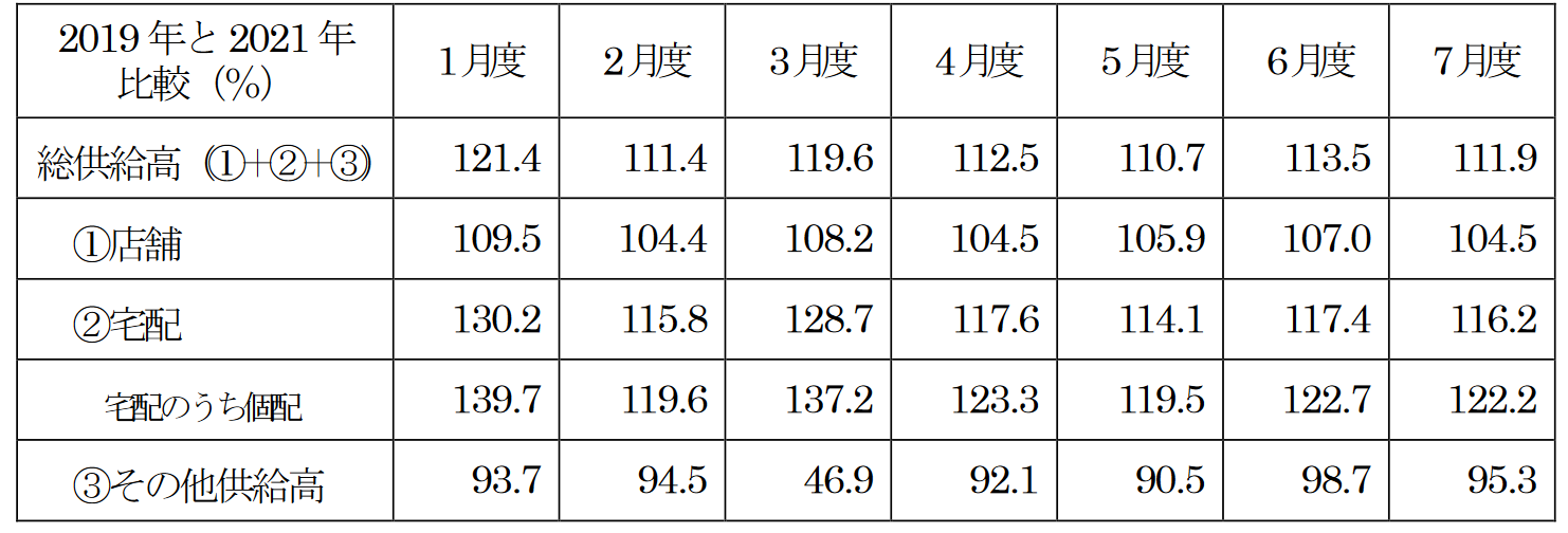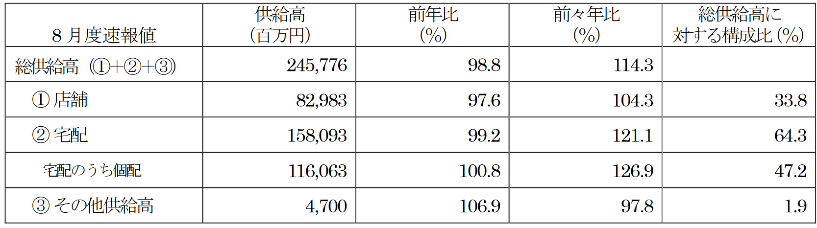 8月度は総供給高(総売上高)が2457億7600万円の前年比98.8%と前年を下回った。前月に続いてコロナ特需の反動を受けているが、2019年比では14.3%増加している。店舗供給高が829億8300万円(前年比97.6%)、宅配が1580億9300万円(前年比99.2%)で、宅配のうちの個配は1160億6300万円(前年比100.8%)。