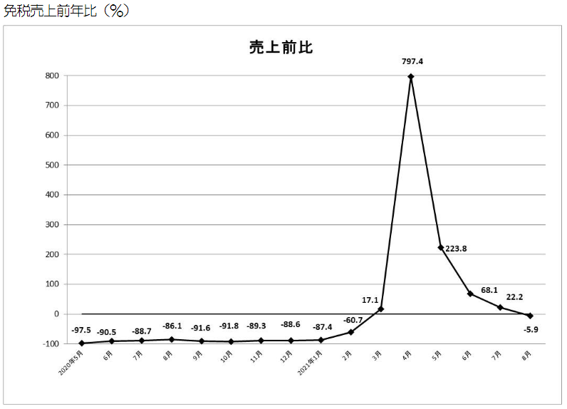 流通スーパーニュース > 統計 > 8月百貨店インバウンド動向|免税売上高33億円、2019年比87%減 8月百貨店インバウンド動向|免税売上高33億円、2019年比87%減 統計 / 2021年09月27日 ツイート 一般社団法人日本百貨店協会(東京都中央区、村田善郎会長)のインバウンド推進委員会が発表した「外国人観光客の売上高・来店動向」によれば、8月の免税総売上高は約33億4000万円(前年比5.9%減)、購買客数は約8000人(31.6%減)だった。一人当たりの購買単価は約42万9000 円(37.5%増)。 2019年比では免税総売上高は87.0%減、購買客数は98.0%減と厳しい状況は変わらない。 ツイート