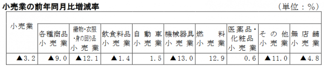 小売業を業種別に見ると、燃料小売業が前年同月比12.9%増、自動車小売業が1.5%増、医薬品・化粧品小売業が0.6%の増加となった。一方、織物・衣服・身の回り品小売業が12.1%減、各種商品小売業(百貨店など)が9.0%減、無店舗小売業が4.8%の減少となった。