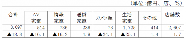 カテゴリー別では、生活家電が25.1%減、カメラ類が24.1%減、情報家電が16.2%減、AV家電が16.1%の減少となった。 一方、通信家電が4.9%の増加だった。