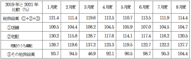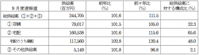 9月度は総供給高(総売上高)が2447億0500万円の前年比101.6%と3カ月ぶりに前年を上回った。2019年比では11.5%増加している。店舗供給高が790億1700万円(前年比101.5%)、宅配が1605億3800万円(前年比101.6%)で、宅配のうちの個配は1175億6000万円(前年比102.8%)。