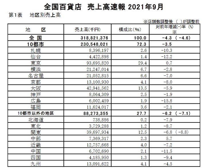 9月百貨店統計|売上高3188億円4.3%減と2カ月連続マイナス