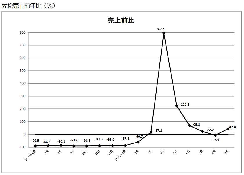 2019年比では免税総売上高は88.1%減、購買客数は98.4%減と厳しい状況が続いている。