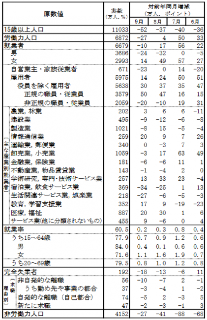 9月労働力調査|就業率60.5%・完全失業率2.8%/卸・小売従業員1059万人