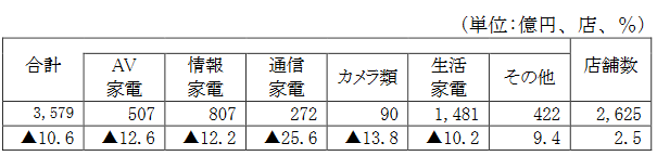 カテゴリー別では、通信家電が25.6%減、カメラ類が13.8%減、AV家電が12.6%の減、情報家電が12.2%減、生活家電が10.2%の減少となった。