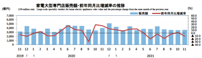 経済産業省の「商業動態統計速報」による家電大型専門店の11月の販売額は3579億円で、前年同月比10.6%減だった。店舗数は前年比2.5%増の2625店。