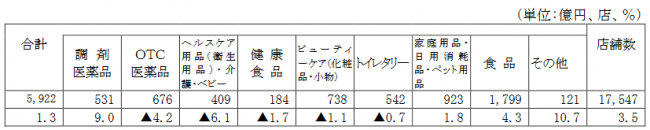 カテゴリー別に見ると、調剤医薬品が9.0%増、食品が4.3%増、家庭用品・日用消耗品・ペット用品が1.8%の増加となった。一方、ヘルスケア用品(衛生用品)・介護・ベビーが6.1%減、OTC医薬品が4.2%減、健康食品が1.7%減、ビューティケア(化粧品・小物)が1.1%減、トイレタリーが0.7%の減少となった。