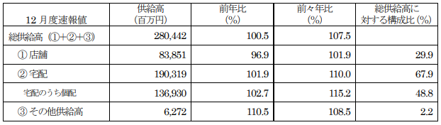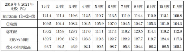 宅配の供給高は1903億1900万円の101.9(110.0%)で、その宅配のうち、個配は1369億3000万円で102.7%(115.2%)だった。内食需要によって冷凍食品や菓子の好調が続いている。