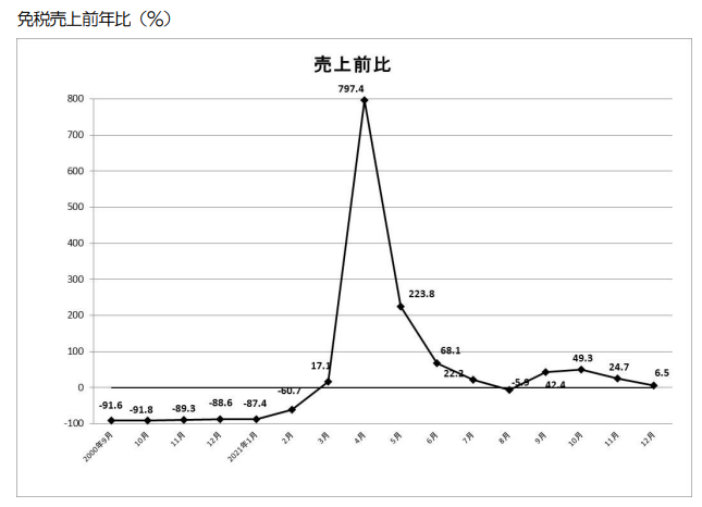 なお、2021年1月~12月の年間免税売上累計は、一般物品が353億6000万円(前年比15.1%減)、消耗品が105億8000万円(60.9%減)となり、免税総売上高は約459億4000万円(33.1%減)で、2019年比では86.7%減とさらに水準を下げている。