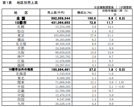 地区別では、10大都市が全地区で2カ月連続前年を超え、11.7%増と二桁の伸びを示した。地方でも1.8%増の2カ月連続プラス。ただし都市との差は、前月よりさらに2.4ポイント拡がった。