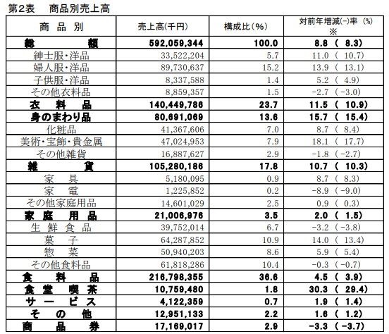 商品別では、主要5品目すべて前年実績を上回った。そのうち衣料品は11.5%増、身のまわり品が15.7%増、雑貨が10.7%増と、二桁増となった。また、ラグジュアリーブランド、時計、宝飾品など高額品の伸長が続いているほか、外出機会の増加で、コート、ジャケット、アクセサリー、旅行用品なども活発に動いた。さらに昨年よりも帰省する人が増加したため、手土産や年末年始需要から和洋菓子も伸長した。おせちやクリスマスケーキは、ECを中心に二桁の伸びを示す店舗が多く見られた。